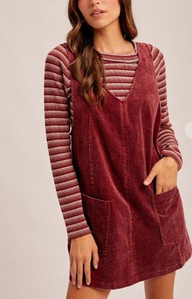 Snow Wash Corduroy Pinafore Overall Dress-RASPBERRY