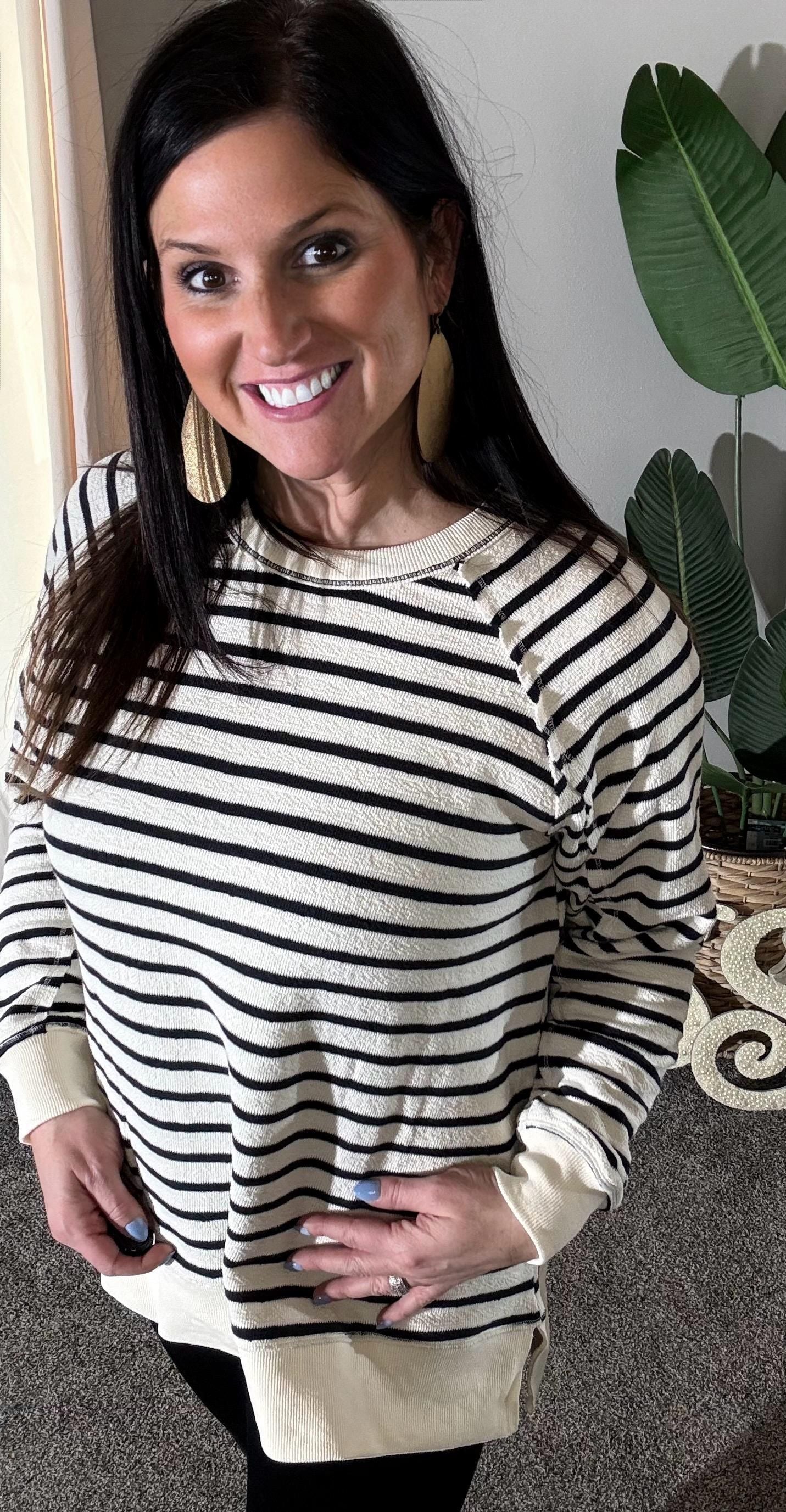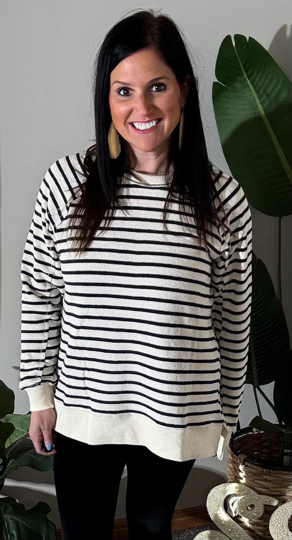 Elevate your casual look with this oversized striped knit top that truly gives you the best of both worlds. It has the cozy, broken-in feel of your favorite sweatshirt but the polished, dressier look of a sweater—so you stay comfy while still looking put together.