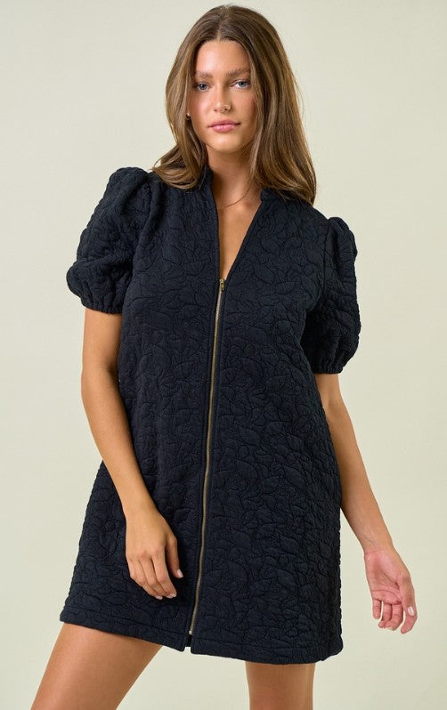 Floral Jacquard Zip Front Puff Sleeve Mini Dress -BLACK