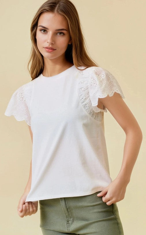 Ruffled Eyelet Short Sleeve Top -WHITE