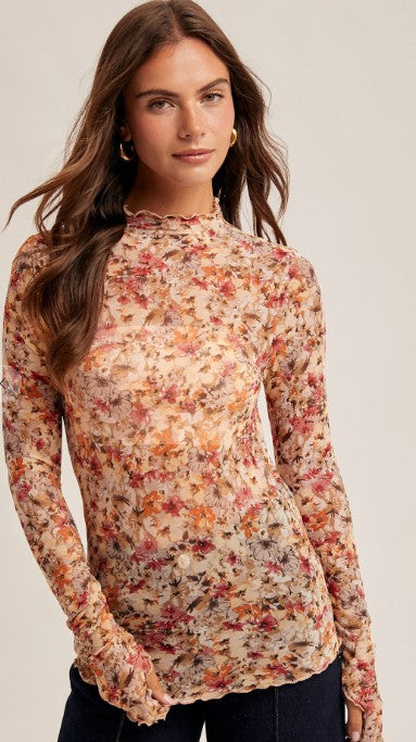 Floral Mesh Print Mock Neck Long Sleeve Top