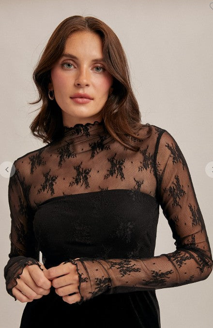 Mock Neck Lace Long Sleeve With Thumb Holes-BLACK